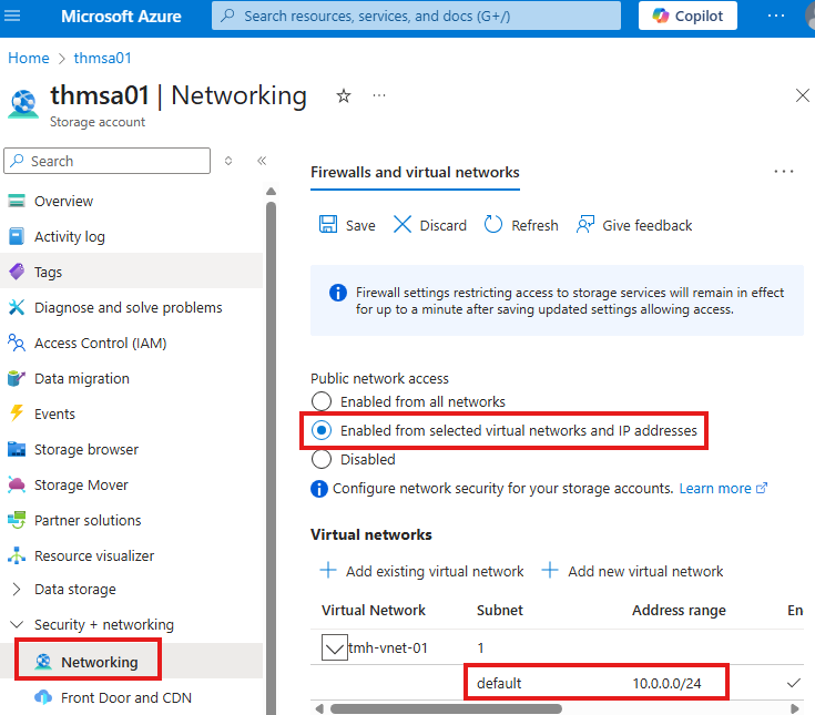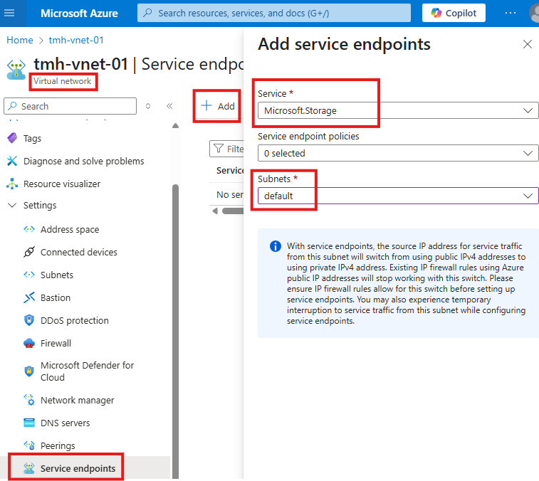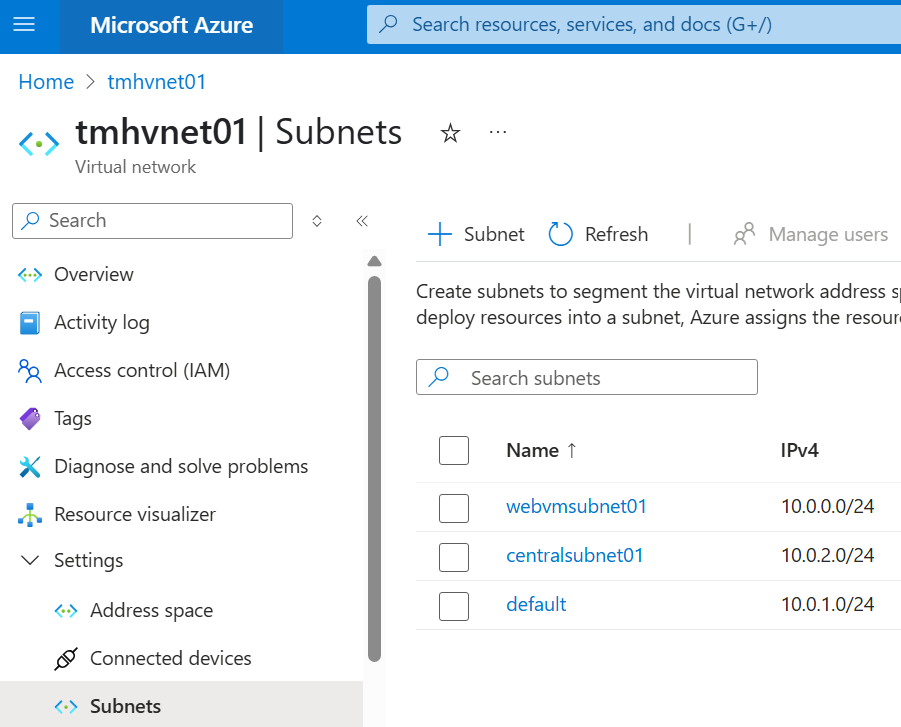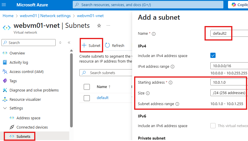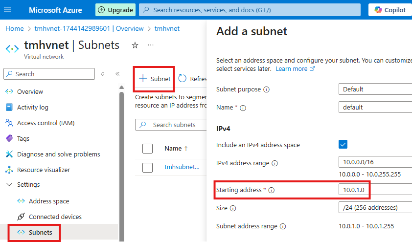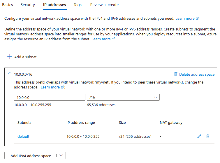 Here we can see the Vnet and subnet address ranges available. We can rename the default subnet.