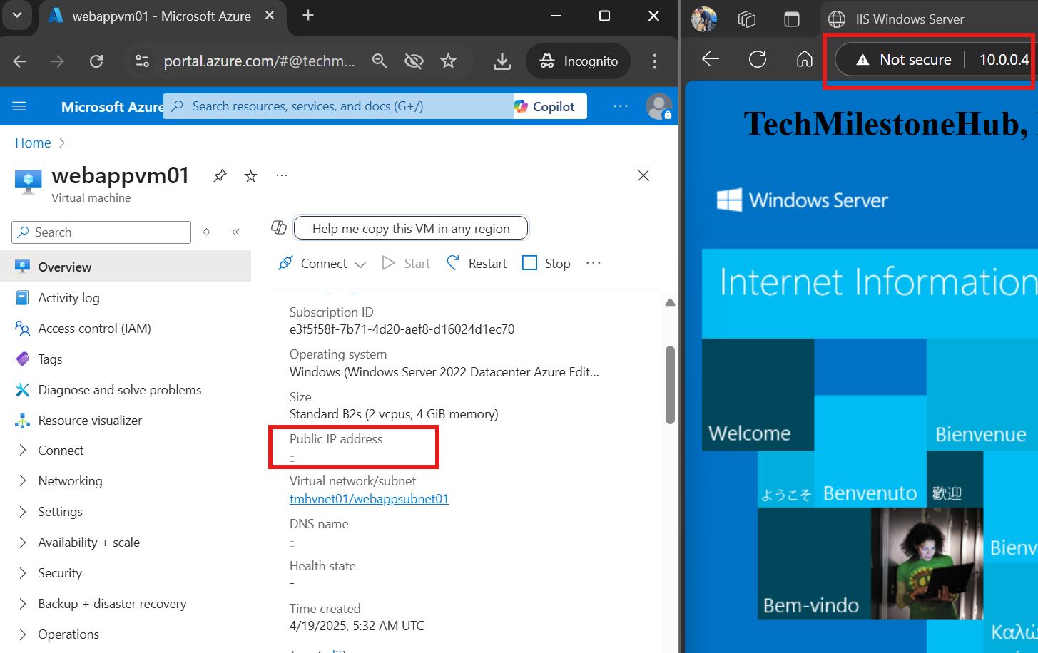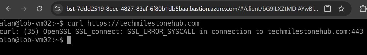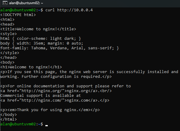 Once the VM is up, we SSH into it from a terminal using the public IP. From there, we update system packages and install the Nginx web server. A simple curl command to the VM’s private IP confirms that the server is working—but it’s still inaccessible from the internet. That’s because public access is blocked by NSG (Network Security Group) rules.