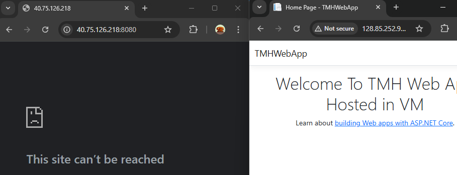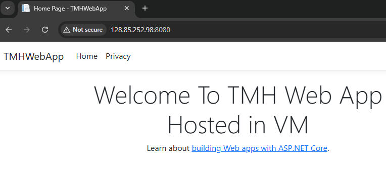 Once hosted, the web app can be viewed from within the VM using localhost. However, this local availability does not make the application accessible from the internet using the VM’s public IP. While it’s technically possible to open port 8080 to allow external traffic, this introduces significant security risks and is not recommended for production environments.