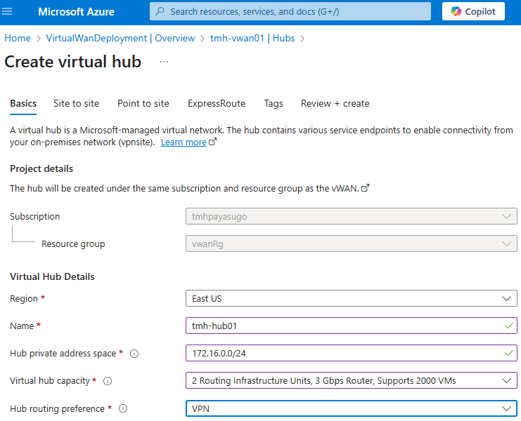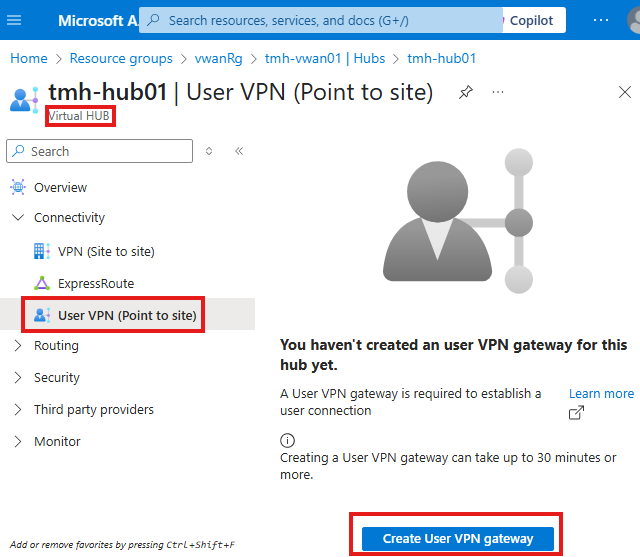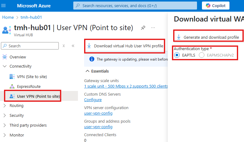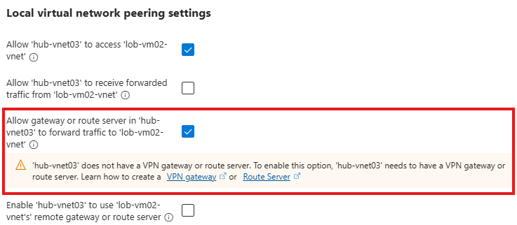 - In the hub network, add a VPN gateway and update peering settings to allow forwarded traffic and gateway access.