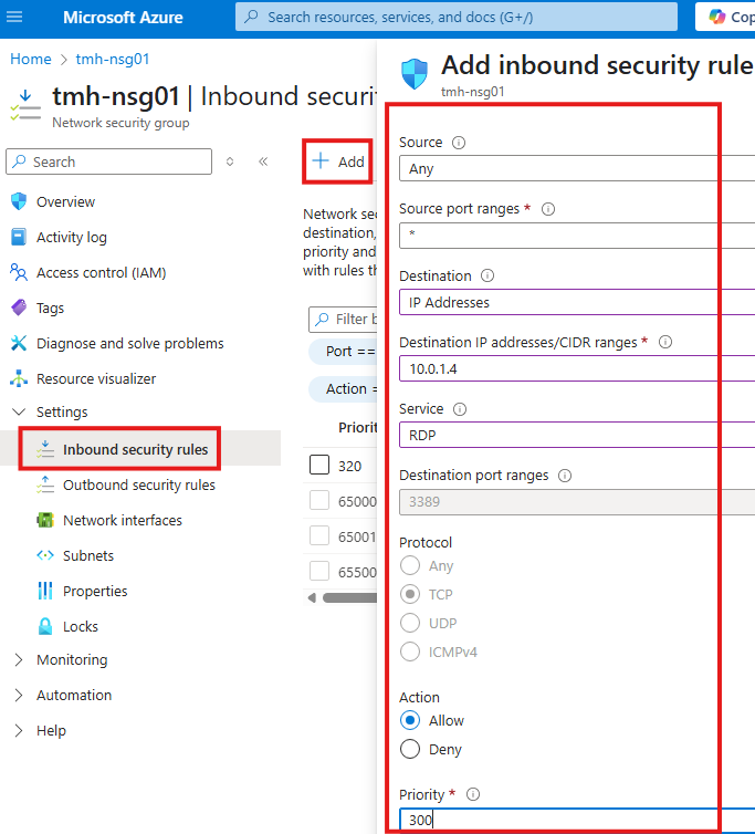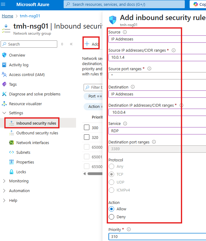If you’d rather not pay for Azure Bastion, you can create DNAT rules. These allow you to connect to internal VMs using the firewall’s public IP, translating the traffic to the VM’s private address.