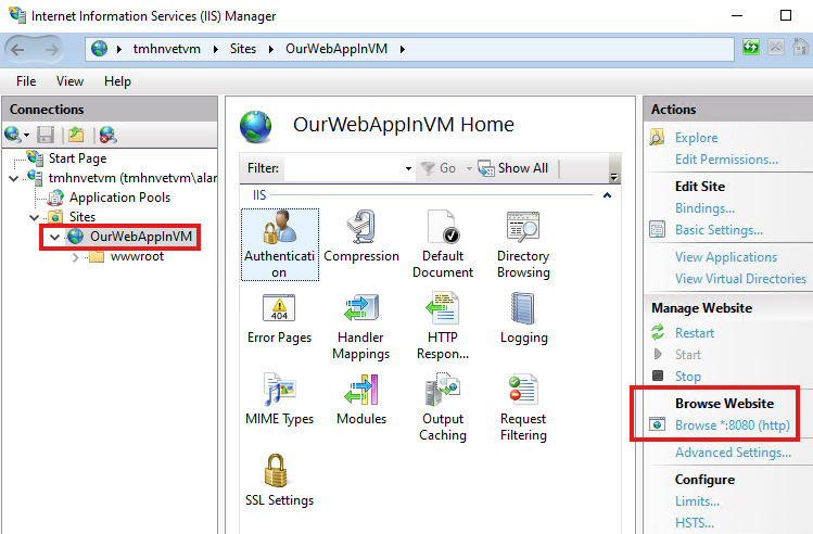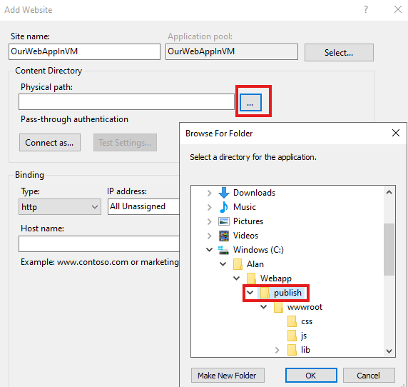 Select physical path of our VM to be the path of the publish folder we copied.