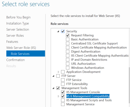 Under Web server roles, select IIS 6 Management Compatibility