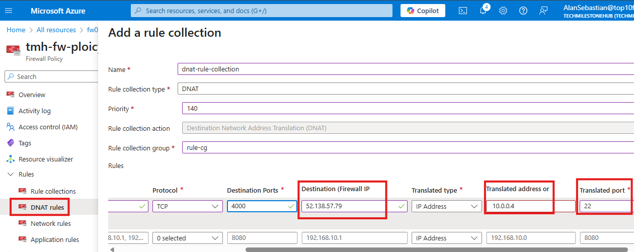 Add DNAT rule so that TCP request to port 4000 of firewall’s public IP, will get translated to private IP of VM