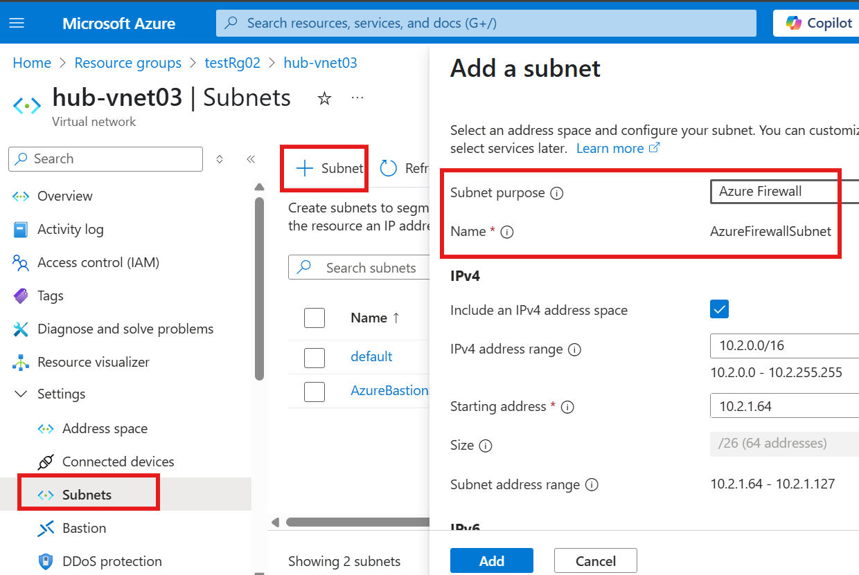 Add a Firewall subnet to hub
