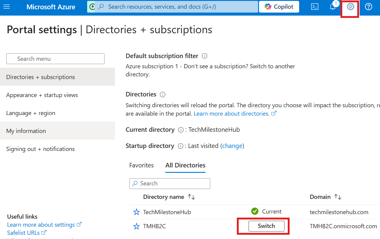 Then, we have to switch tenant to B2C from Settings > Directories + Subscriptions