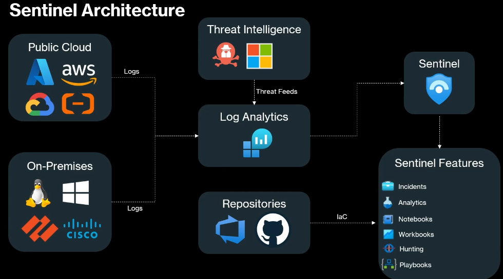 Microsoft sentinel is resource in Azure, that works on top of another resource Log Analytics workspace, analyzing data sent to Log Analytics workspace and looking for any threats.
