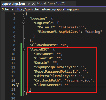 appsettings.jsonwith Azure B2C configuration values (like tenant ID, client ID, instance URL) - Configure authentication using these settings in your startup code