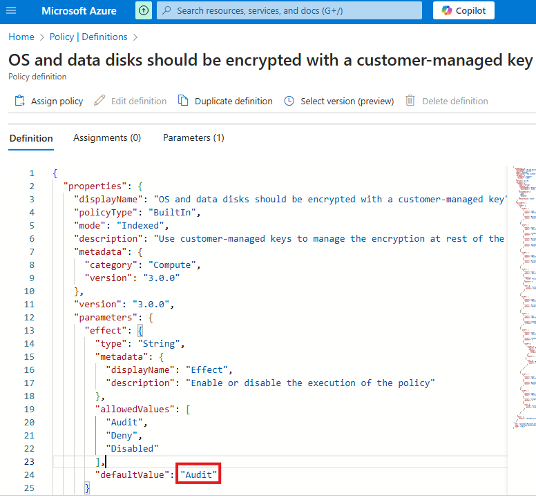 defaultValue will be Audit. For some policies it will be remediation, in that case we have to make changes to make it align with policy.
