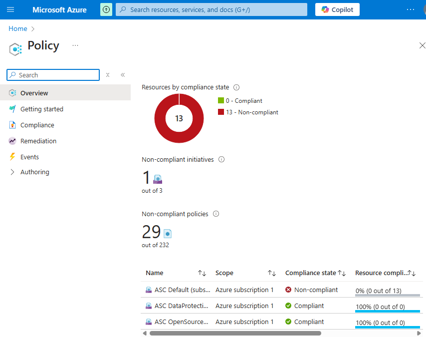 - Azure scans your resources and shows which ones are compliant or not compliant.