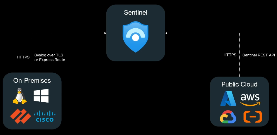 Sentinel receives data through ExpressRoute, VPN, or HTTPS (REST APIs).