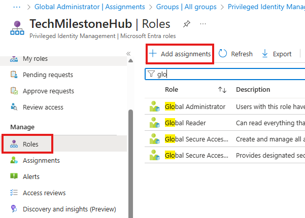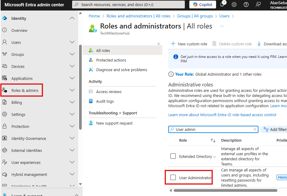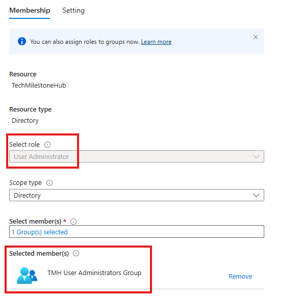 Now, when the group is created we can assign the User Administrator Azure AD role to this group.