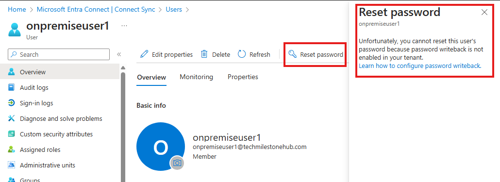For hybrid synced users, admin cannot reset password from Entra Admin Portal.