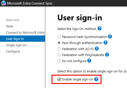 2 – In AD Connect tool(In AD Connect server) > Configure > User Sign-in : Enable Single sign-on
