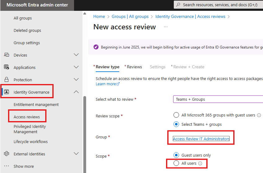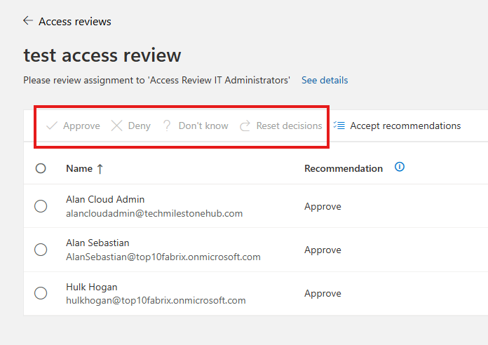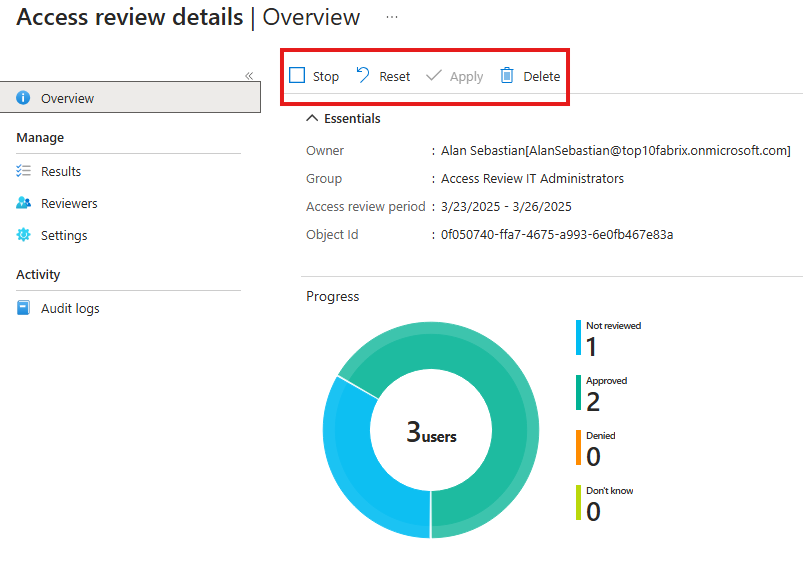 Here we reviewed if users need access to be in the group called Access Review IT Administrators.