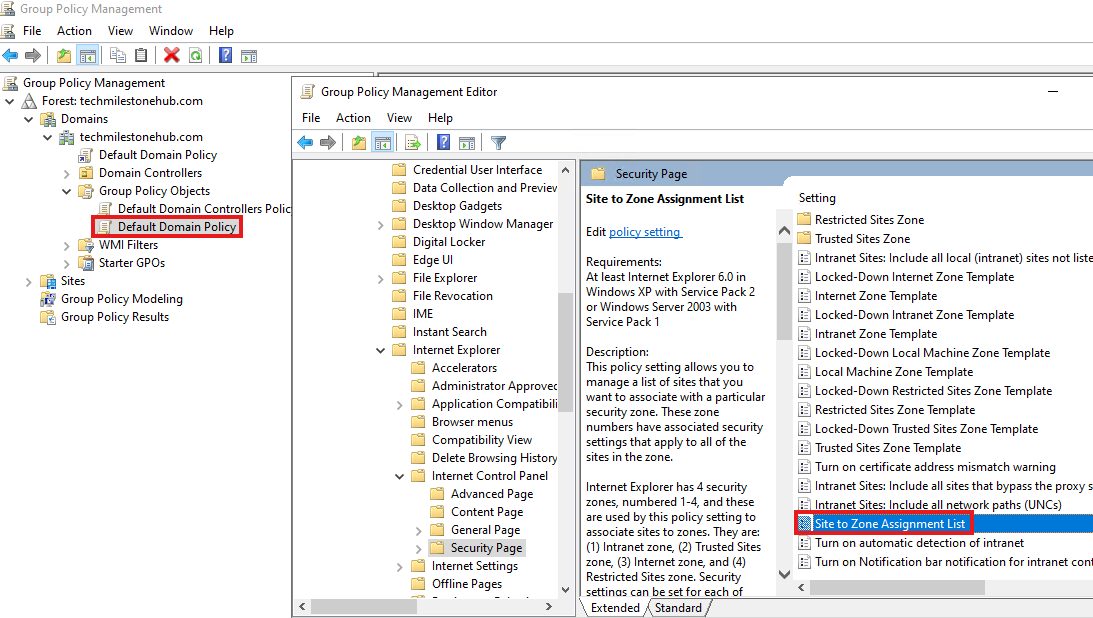 Go to User Configuration > Policies > Administrative Templates > Windows Components > Internet Explorer > Internet Control Panel > Security Page. Select Site to Zone Assignment List.