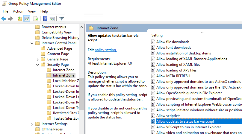 Go to User Configuration > Policies > Administrative Templates > Windows Components > Internet Explorer > Internet Control Panel > Security Page > Intranet Zone. Select Allow updates to status bar via script.